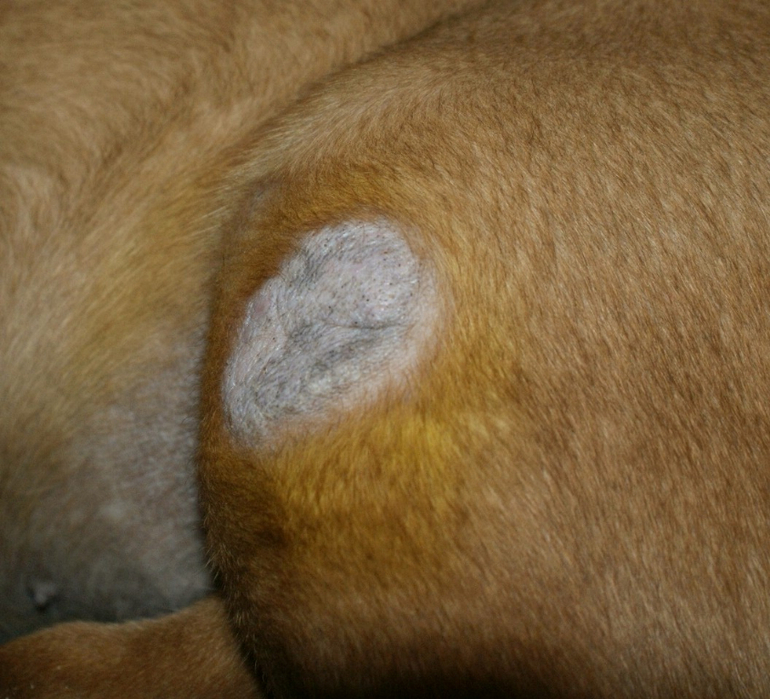 Болезни любимцевЩенок возраст 1 месяц и 22 дня. Месяц назад потускнела шерсть на сгибе задней ноги , при попытке разДвинуть шерсть стало понятно что на месте пятна корочки которые отлипли вместе с шерстью, На месте пятна кожа утолщенная воспаленная - буд-то бляшка .Не большой зуд в целом т.е. то там почешется , то в другом месте , зуд не ярко выражен.