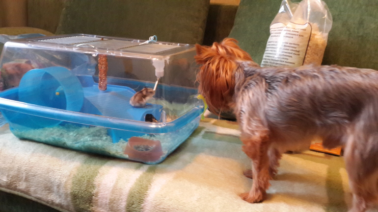 Поздравляю с пополнением! Как кошка на хомяка реагирует? Я тоже о мелкой живности мечтаю и о попугае, но боюсь, кошка не даст им жить спокойно)))