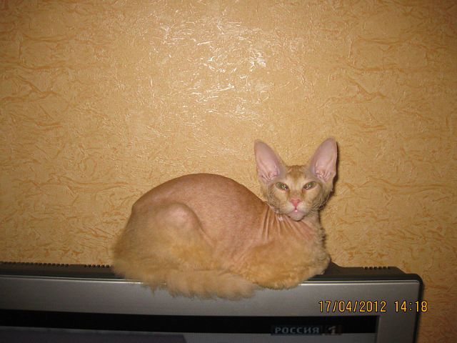 Лапочка 😍😍😍😍 Это рыжик настоящий 😀😽 окрас красный табби , полоски пропадут, будет , как наша кожа такой когда вырастит , растянется окрас Про породу точно никто не скажет, а так похож на 99% на Дона Выделения из глаз это норма и особенность лысых кошек, пойдете к ветеринару -сразу анализы назначат, тк для других пород это не нормально!