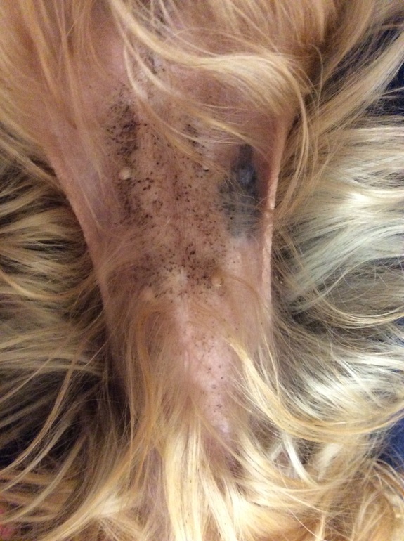 Собаки. Болезни, прививки, советы по уходуДевочки, подскажите что это может быть у собаки но животе. Её не беспокоит. Не чешется. Если поскрести, отходит, но не грязь. Не блохи???? У нас Йорк, 10 лет, девочка. Справа черное это клеймо.