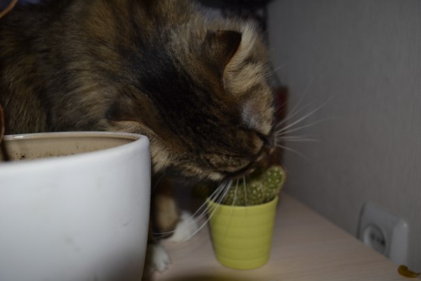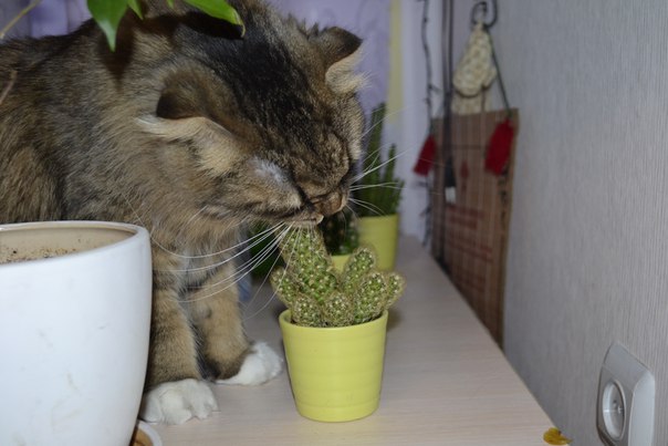 Удивительный кот! Представила как он в ванной катается))) Наша котейка фикус любит погрызть, но чтобы кактус?! Неужели не колется?))