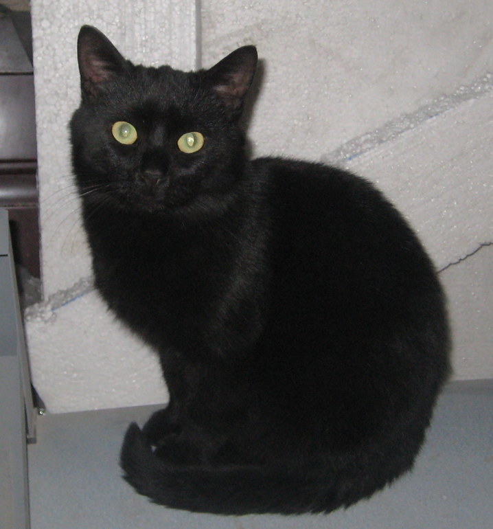 Дебильное имя для кота, не правда ли? Но у него своя история. Этот котик стал приходить под окна моего пустого дома ещё прошлой зимой, когда моих подобранцев ещё не было. Был ужасно дикий. Одаривал меня взглядом полных ужаса восьмикопеечных глаз и, чуть не стелясь по земле, убегал в темноту. Освоился он уже где-то в середине августа, когда мы переехали в свой всё ещё недостроенный дом. У соседей тоже чёрный гладкошерстный кот. Чёрный-пречёрный. А у этого на солнце красноватый отлив. Чтобы их как-то обозначать, мы с братом стали называть его - Красный. "Красный приходил, Красный осмелел, Красный еду из руки взял". А когда Красный дал понять, что уже никуда не уйдёт, оставалось уже звать его - Красик. Отзывается =)) Поначалу воровал и гадил. Теперь ходит только в лоток (ттт) и не шкодничает.