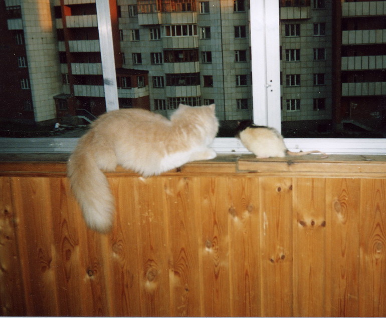 Хорошая крысуля)))) Вопрос по теме - вы интересовались возрастом крыски (это мальчик или девочка?) Вы готовы, что года через 2-3 (это в очень лучшем случае) крысули не станет? Они, к сожалению, не живут долго( У меня был крыс, очаровательный парень, с кошкой дружили, вместе тусовались на балконе и смотрели на улицу, фотку приложу) Но наш крыс умер в возрасте 2 лет, врач сказал, что крыски дольше 3 лет и не живут особо((( Больше крыс не завожу... Вот крыс Стью и кошка Фрося) Дело было в далеком 2003 году.