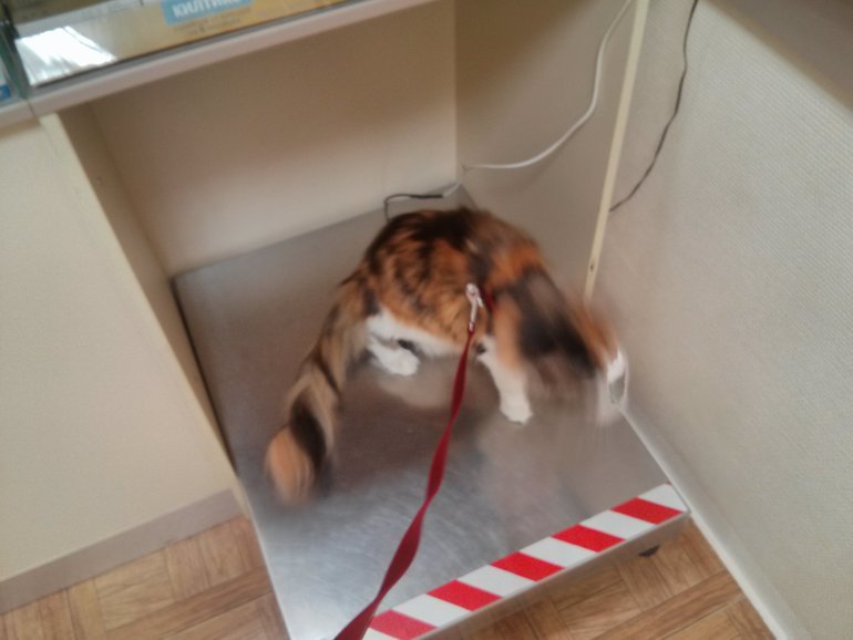 От мира она отвыкла, возмущалась фактом выноса её из дома, дрожала и переживала. При приближении машин нервничала и хотела что-то сделать, и это что-то однозначно не геройское. Для полного счастья на момент прихода кроме нас в клинике было три собаки :)