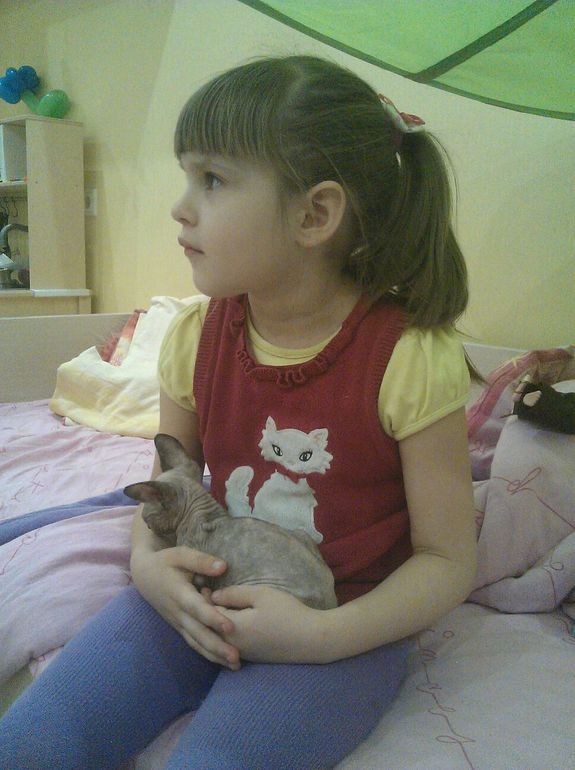 Оля очень обрадовалась подарку. Поначалу она даже не поверила, что это ее кошечка)) Постоянно ее тискала, не отходила. Кстати, кличку Катя дала ей она сама) Не знаю почему, но вот "так ей самой захотелось". Ну Катя, так Катя)