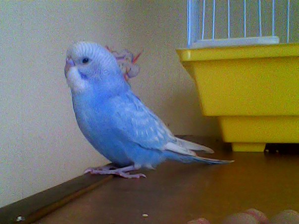 Теперь проблема в том что дочка выпустила его погулять, наверно еще рано...и Кеша не желает сидеть в клетке кроме как ночью)) выучил где кормушка подлетает, поест и обратно, а если запереть, то поднимает решетку и пытается вылезти..в другую комнату не пускаю, пусть пока думаю в одной освоится. Рук уже практически не боится, дает гладить себя, сам пару раз сел мне на плечо.
