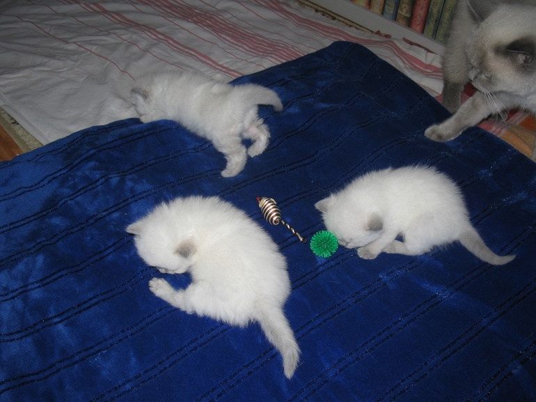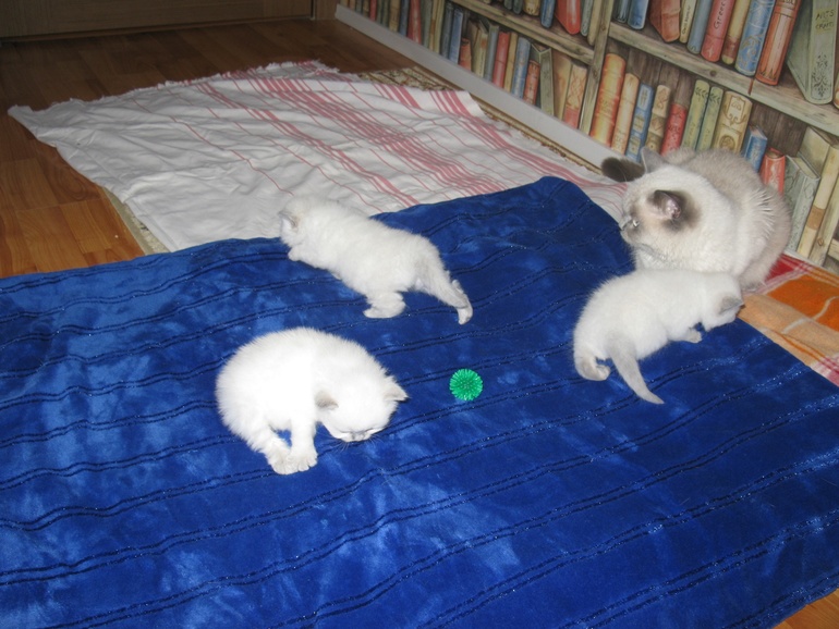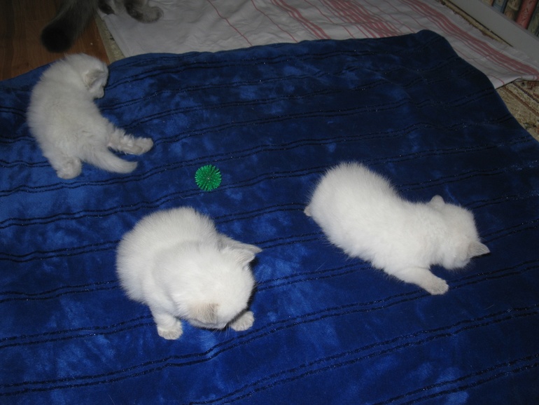 А они или их мама играет этим зеленым шариком? Я вот своему купила котенку подобный) он ему не интересен. Гораздо больше нравится маленькая мягкая мышка и другие небольшие мягкие игрушки, особенно если они двигаются, а также дразнилка с перьями) а твердый колючий шарик вообще не оценил.