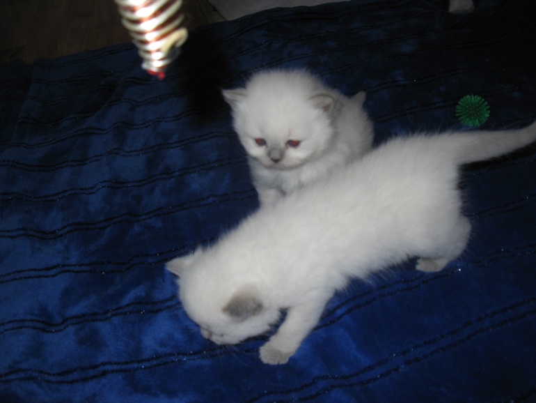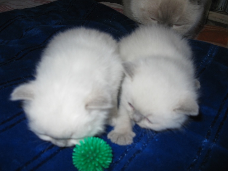 Они пока не во чт о не играет, только начали друг с другом играть. А кошка гоняет мячик еще как хорошо.....