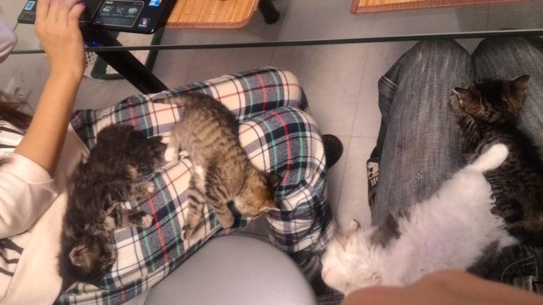 Оказалось, котята были приучены к лотку, значит их кто-то просто выкинул на улицу. Неделю они всей толпой наводили беспорядок на кухне и в комнате. И мой ужин проходил обычно так