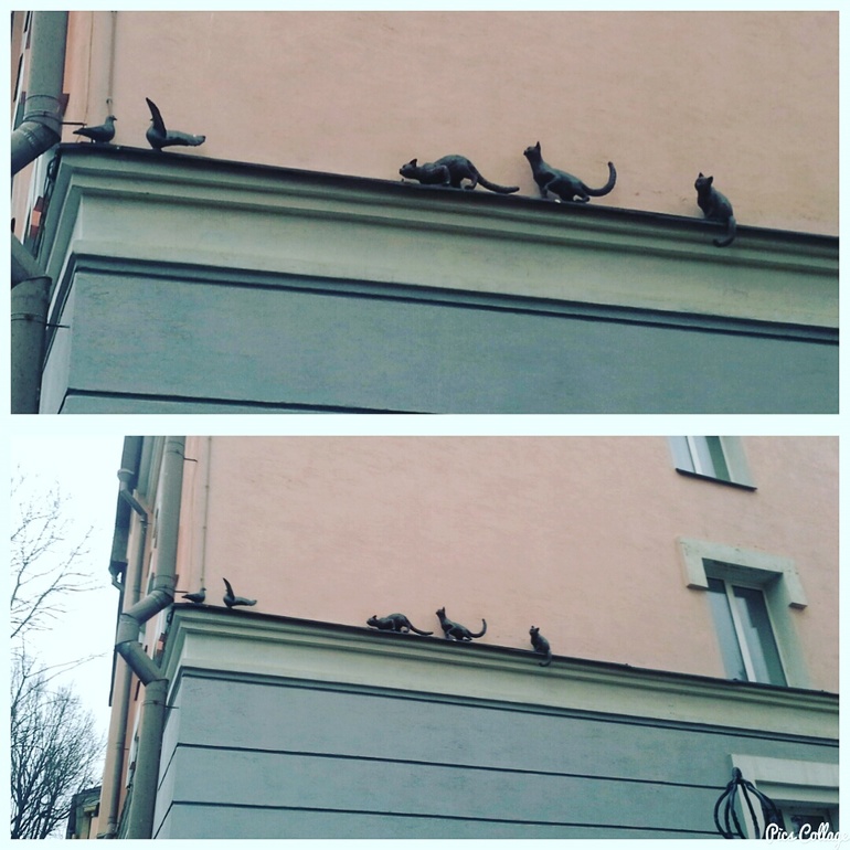 2. Не знаю как называется, но забавно. Находится эта скульптура во дворе дома на парапете, не все местные о ней знают. Три кота пытаются поймать голубей, но не суждено.