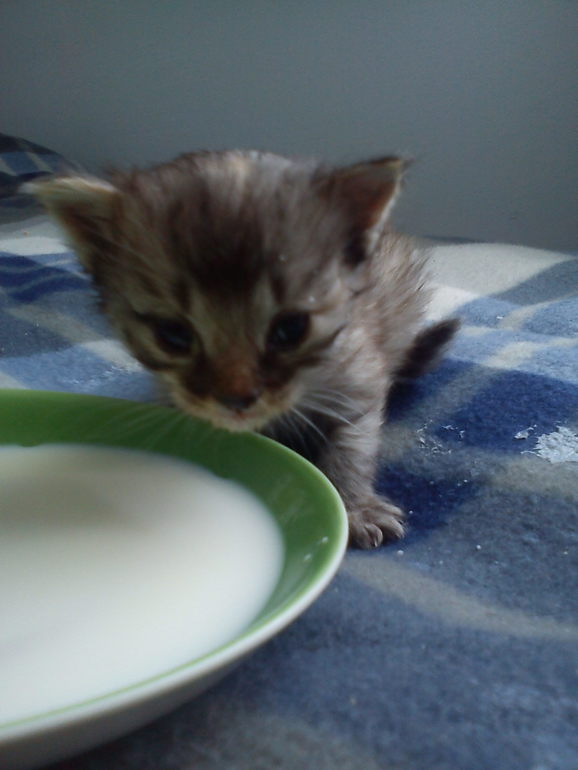 Отвезла домой, попыталась дать молоко, но она только слизывает с краев. Лакать плохо еще получается. На вид недели 3 ей.