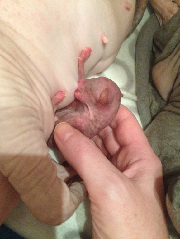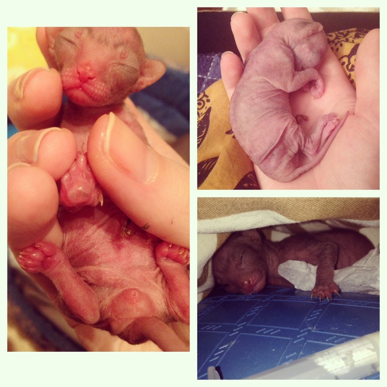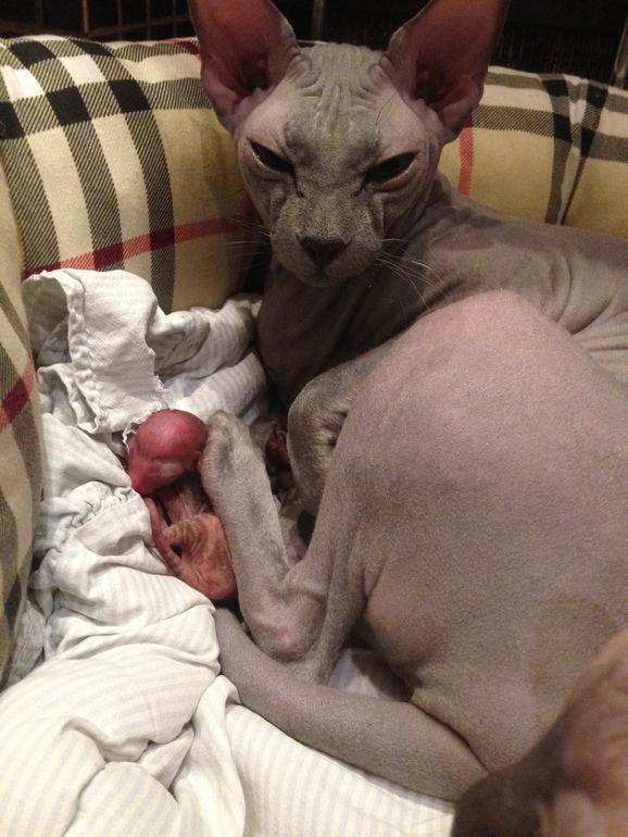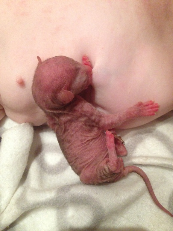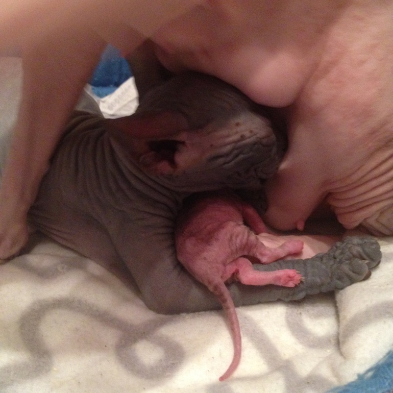 Ночью 17 мая родила моя другая дочка Лю( живет не у нас ) 2 х котят , одного усыпили ( то ли патология, то ли врачебная ошибка, не видела его и не могу сказать , что точно было) второй малышок родился живой, с критически низним весом 47 г! Первый день сосал, на второй мать бросила его , хозяева принялись выхаживать , но опыта у них никогда не было и совсем новички в этом деле, про его вес я узнала только на своих весах, они говорили , что маленький он и все, я то отдала своих котят ещё 16 ого вечером, кроме Немочки Клео, подумала Мотя его примет точно, вытянет и я подкормлю, сделаю доброе дело и спасём маленькую жизнь ! Зная ,что кошка чистая , взяла котёнка спокойно себе , мой внук как ни как!