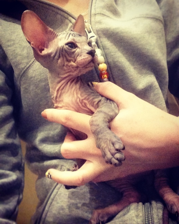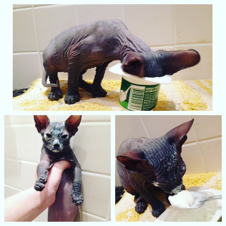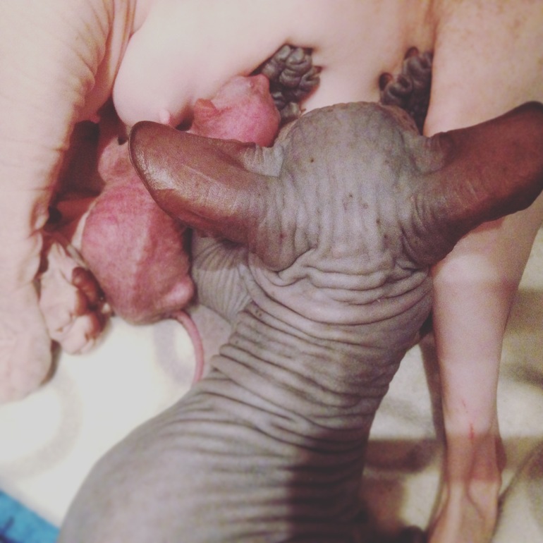 Когда я его увидела, офигела, мой самый маленький котёнок был Йода 87 г и я его кормила сама из бутылочки , тряслась за него, а этому даже соска велика была , только шприц!!! Он был такой маааааленький, но такой боец!!!! Ещё сразу заметила вывих задней лапки, то ли врождённый, то ли кошка ему лапу перекусила , тк были следы царапин на голой ножке... Его приняла Лю , у меня много видео, как она его грела, под себя клала , заботливая такая, как родного любила,он ее сосал, но там пусто для него)) хотя выяснили , что Мотя!!! Моя кошка-мама Лю сосет сама и одна сися, именно одна сися молочная!