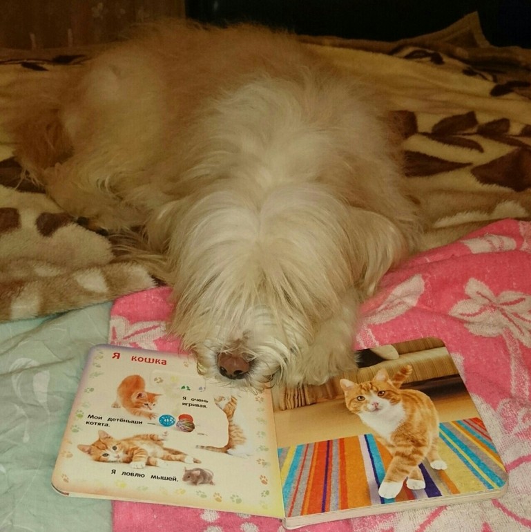 И вот так наше домашнее животное (простите...)) ТТ Тибетский терьер...на языке монахов из Тибета - маленький мохнатый человек) учит животных по книжкам нашей малышни) Точнее учат они вместе, т.к. деваться ему некуда)