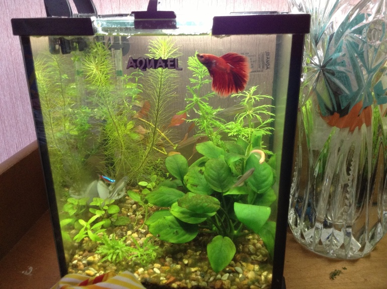 1. Аквариум . Сначала, подумайте, где разместить, учитывайте вес - стекло плюс 10 литров воды плюс пара кг грунта. Поверхность должна быть прочной. Если полка, убедитесь, что она не рухнет. Мне очень нравятся такие аквы на письменном столе. На него не должен попадать прямой солнечный свет, поэтому на подоконник ставить нельзя. Ваша мама хочет круглый, но я бы советовала кубик, он гораздо эстетичней, за ним легче ухаживать и лучше видно обитателей. В зоомагах их полно совсем недорогих. Можно взять акваэль - очень красивый, лампа в комплекте уже, нагреватель и фильтр (хотя, если все сделать правильно, он нам не понадобится).