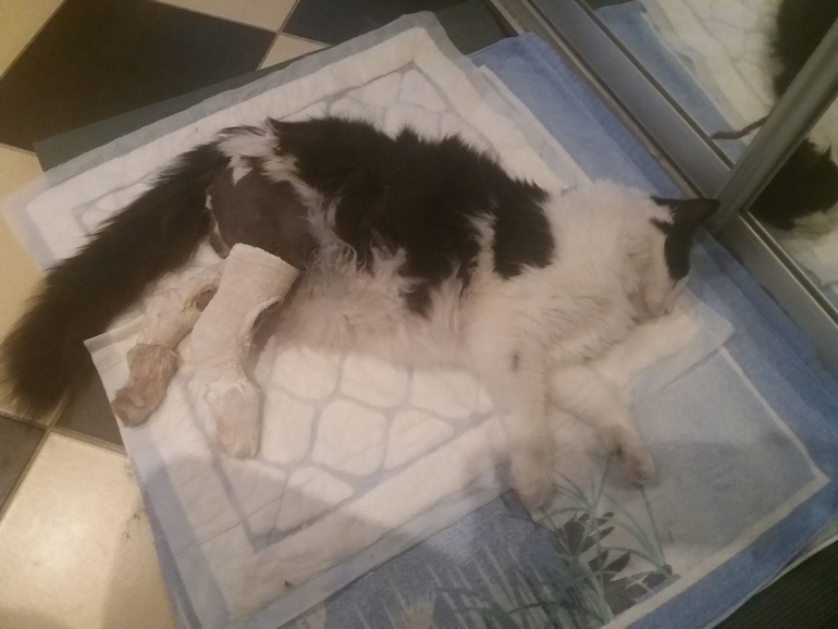 А так вчера он кушал и утром кушал. После этой операции еще не кушал, конечно же. Лежит. Надеюсь очухается от наркоза. И очень хотелось бы чтобы лапки начали заживать.