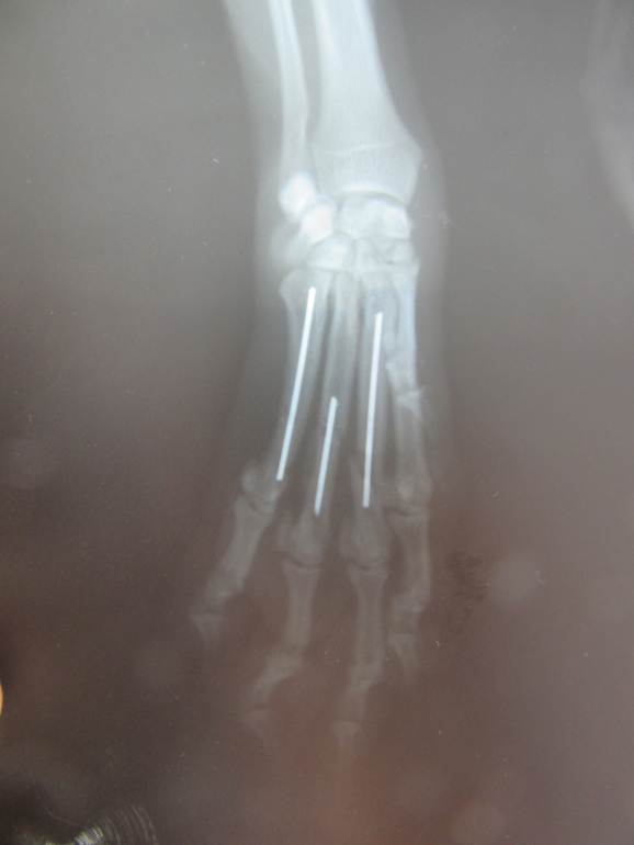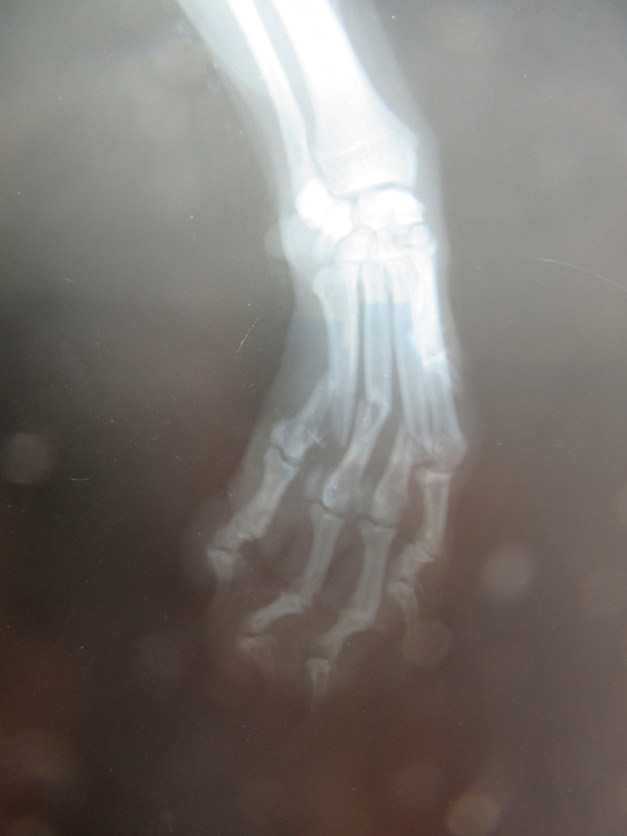 Перелом случился по вине моей и мужа,понятно было сразу,что лапе п.здец,собака очень плакала.Сразу же муж повез Варю в ветеринарку,откуда его направили на рентген на Кр.Путь 139 б клиника "Биота".Сделав снимок выдали заключение "Полный перелом 3,4,5 пястных костей со смещением передней левой лапы".Время шло к закрытию.Муж шокирован,ему что-то обьясняют врачи,он сказал что мало что понимал от состояния своего.Сказали сразу-операция,стоимость 10 т.р.Сутки на подумать.Не понимаю почему муж сразу же не записался на операцию,меня не было с ним.Пока он ехал я обзванивала беспощадно закрывающиеся ветклиники......Многие этим не занимаются,а другие говорят "Приходите,консультация 500 р,а там будем решать гипс или операция".ШТЭ???????????Какой нахер гипс,бля?????????Бегите из клинике,если озвучив такой диагноз вам говорят про гипс!!!!Собака лежала весь вечер и всю ночь на месте,передвигалась по надобности на 3 лапах.Я твердо решила,что врачи в клинике Биота адекватные,вынесли верное решение,вставлять штифты.
