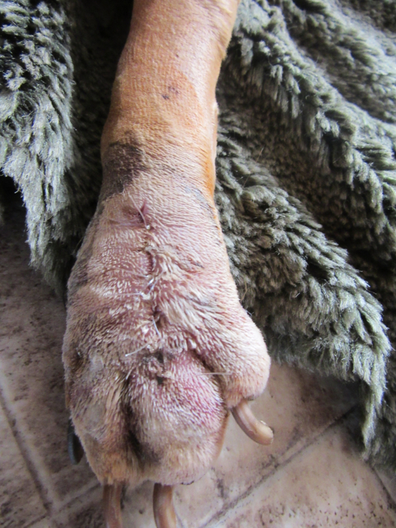 В 17.00 мы были дома.Сразу не догадались высадить собаку на травку на улице пока были,дома она пописила под себя от безвыходности.Я ее попоила бульоном от борща со шприца.И весь вечер каждый час на 10 мин я прикладывала замороженный кусок мяса,замотанный в марлю к лапке прям на швы.Потом намоченной ваткой хлоргексидина массажировала лапку,из специально оставленной врачом для этого дырочке выходила сукровица и кровь.На ночь муж вынес Варю пописить на руках,по травке она побегала сама,без воротника ей намного удобнее ходить.Поставили на ночь обезбаливающее,сразу видно как становиться кайфово собаке,поэтому я делаю все кормления и процедуры с лапой до укола,что бы после него она поспала.