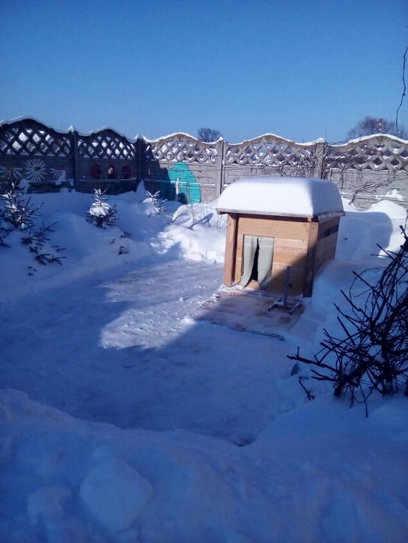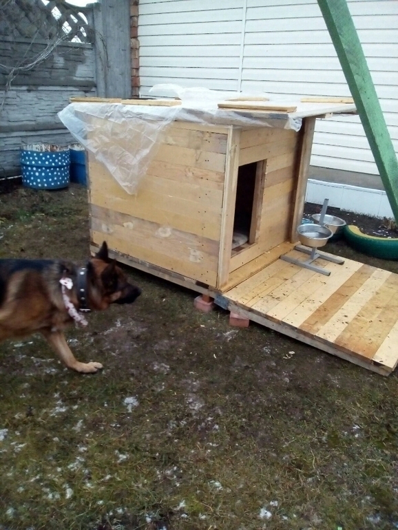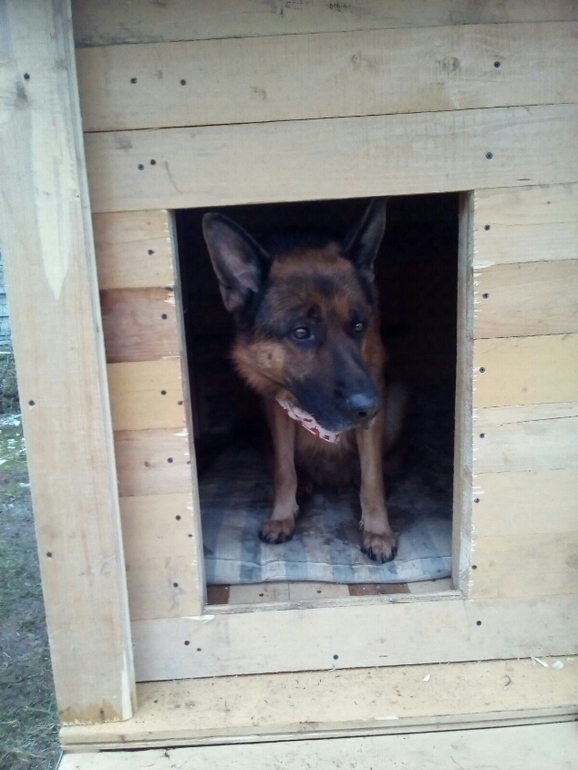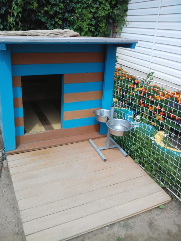 Наши любимцы!Построили его еще осенью,двойной пол с утеплением,на зиму вход закрываем одеялом,старый матрац,перед будкой помост из досок.сейчас весной покрасили его.стало вообще классно🐶