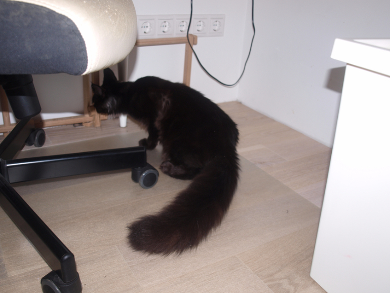 Поведение.. ну, это кошка))) я от него собачьего поведения и не ждала. Гладишь - мурчит, говоришь - отвечает. Спит - днём, тыбыдым тыбыдым - ночью (на пару с Макчо).