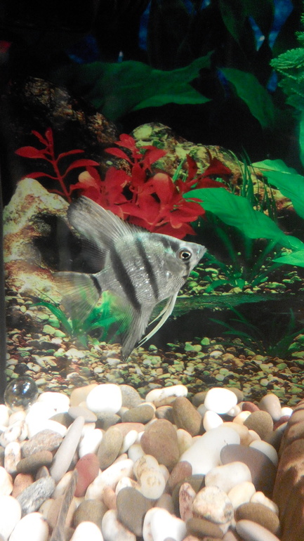 Рыбки, аквариумыДавно хотела купить голубую скалярию. И вот недавно приобрела! Радости моей не было предела! А тут еще сюрприз приятный - она оказалась хамелеоном! Точнее, у нее полосы то есть, то нет. Уж не знаю, от чего это зависит, но наблюдать очень интересно! То она ярко полосатая, будто зебра, то полосы прям на глазах, за несколько секунд бледнеют и исчезают! Класс! Фото прилагаю!