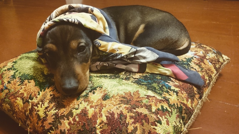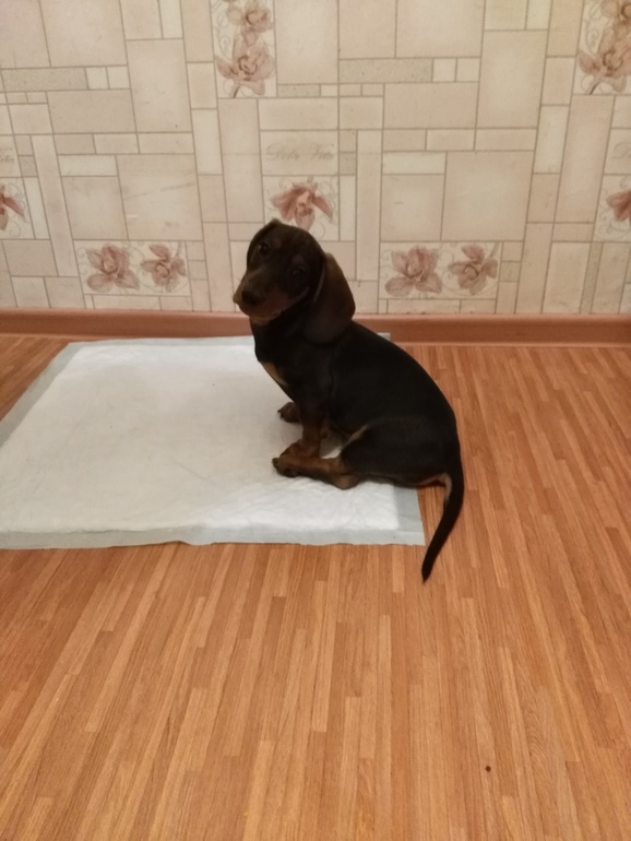 Еще через пару недель щенок самостоятельно отказался от пеленки на кухне. Теперь она используется как подстилка. Планирую скоро ее убрать вообще (лежит на всякий случай)
