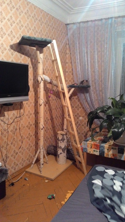Плюс в том, что шторы дома целы, мебель не дерется, ну по крайней мере, в нашем случае, хотя сначала попытки были. Периодически нужно будет обмотку перекладины менять - дерет ее просто нещадно.