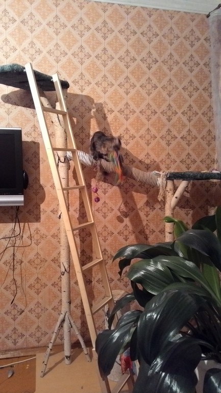 Кошки. Болезни, прививки, советы по уходуПриехали к родителям, а у них во всю уже тест драйв окончательного варианта идет. Кошка так носится по этой своей "стенке", если бы сама не увидела, то не поверила бы, возьмет игрушки в пасть и путешествует по ней.