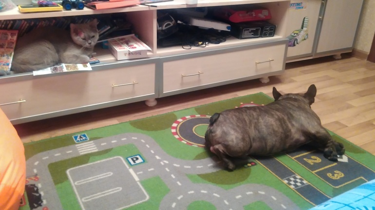 красавица и умница , но шипит на собаку за киллометр видя его , в первый день познакомили их издалека естественно пес рвался познакомится и единственное что угрожающе с его стороны звучало , это когда по ламинату цокал когтями , не очень приятный шум , кошка забилась в угол и стала шипеть и издавать угрожающие звуки как рычание , увели собаку и дверь закрыли , хотели ее погладить она шипела на нас и лапой дралась выпустив все коготки , на протяжении 6 дней мы пытаемся их познакомить потихоньку , держа собаку на руках чтоб он не цокал когтями , но кошечка ни в какую шипит и дерется , хотя ближе метра не подносили , садим ее специально на стол где ей комфортней ,так как заметили ,что она сама туда бежит прятаться , а сегодня собака когда мелкий открыл дверь забежала и то не к ней а к еде кошачьей , она сидела около дивана и увидев его побежала , а он за ней , она не успев забежать в убежище перевернулась на спину шипела и лапами махала , страшно смотреть на все это и ее жалко я представляю какой стресс для нее и собаку вроде ругать не за что , он стоял как истукан и пытался обнюхать , как их подружить , основное ,что из за этого туалет кошкин стоит в комнате дочки , хотелось бы быстрее его перенести в ванну да и вообще не бояться открыть двери и их встречи , а сейчас как на войне , все следим чтоб двери были закрыты и выпускаем погулять их по квартире по очереди , кошечка явно потом в стрессе она бежит сразу на горшок и боится каждого шороха , жалко крошку , наверное мы повелись зря на дочкины уговоры о кошке , да и сами конечно хотели , но не думали что так сложно будет