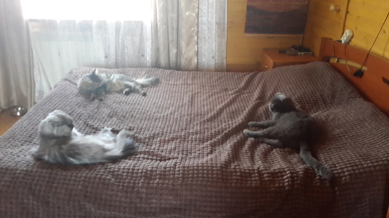 Все спят вместе. У нас в семье собаки знают, что кошки - выше их в иерархии и трогать мелких нельзя никогда и ни за что. Терпят всё и кровать делят, скипя зубами и с недовольной мордой, но делят)))))))