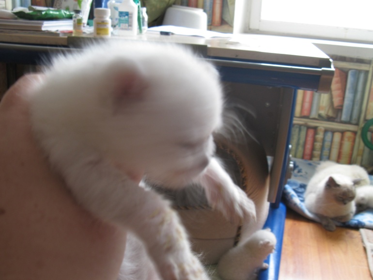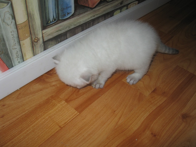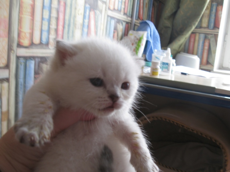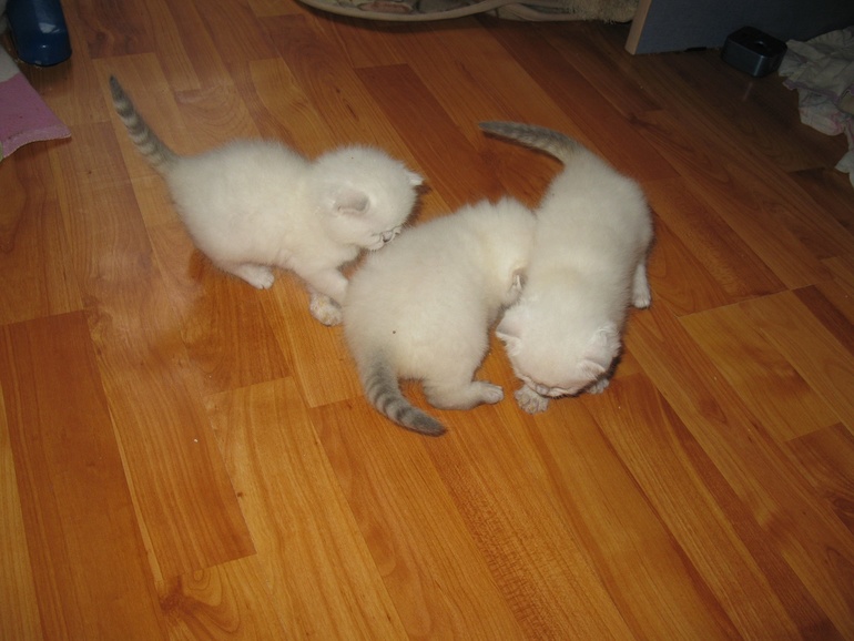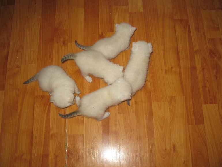 Все котята будут с ярко-голубыми глазами. Окрасы : BRI as 11(21)33, ns 11(21) 33 - ну это скорее всего девка ( а она пока под наблюдением питомника ) . Возможно кто-то из мальчуганов будет ДШ . Пока они слишком малы.