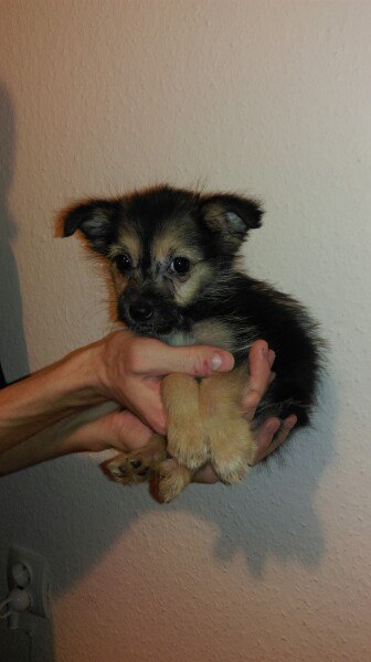 Шерсть торчит в разные стороны (но шерсть жёсткая), окрасом напоминает обычную дворняжку, для цверга слишком много желтого окраса,сама собака мелкая, коротконогая, там где должна быть борода есть что-то подобие, (может быть в будущем там и будет шикарная борода), но пока это какие-то два маленьких отростка по бокам морды=) Уши не то стоят, не то висят. И если честно там больше йорка.