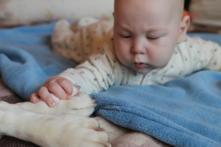 У моей подружки такой же пес, и малыш чуть постарше вашего. Тоже дружат так)))) собакен у него вкусняшки отнимает.