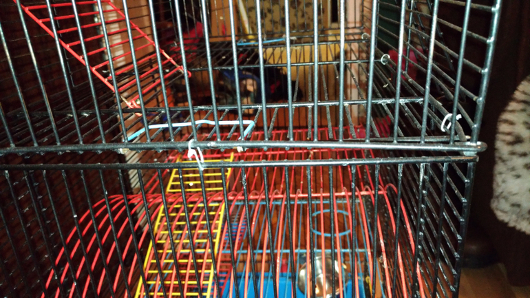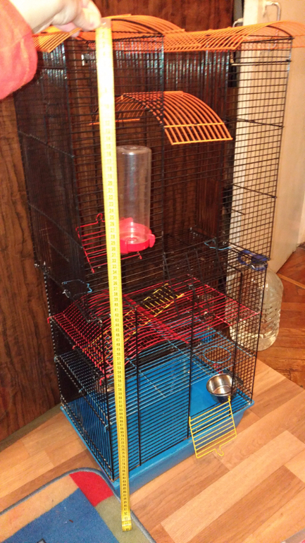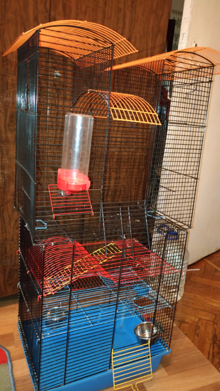 Добрый день. Продам большую клетку для грызунов. Две большие клетки скреплены металлической проволокой, получается 4 этажа, и на верху остается место для подвешивания качелей, домиков, гамаков. Высота клетки 90см, есть 2 поильника маленький 120мл на первом этаже, и большой на 250мл на 4 этаже. В низу 2 миски закрепленные к клетке.
