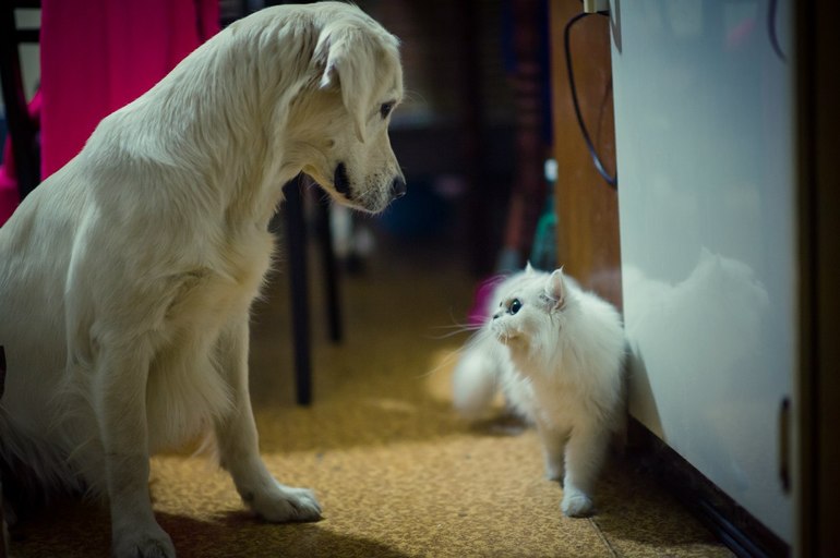 у нас голден ретриверы. Любят всех. Не лают в квартире, не портят мебель и не воняют :) Кошки есть у родителей, отлично и с ними они ладят. Хотя впервые собака их увидела в возрасте двух лет. Агрессии не было никакой. Потом были котики на передержке во время отпуска знакомых. Тоже никакой агрессии не проявляли никогда. Это в принципе у всех в породе. Они не могут причинить кому-то вред. :-)