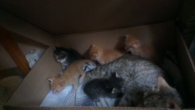 Котят много. Так много еще никогда не было. Три мамы кошки и их дети. Семьи с 5, с 4 и с 3 детьми.