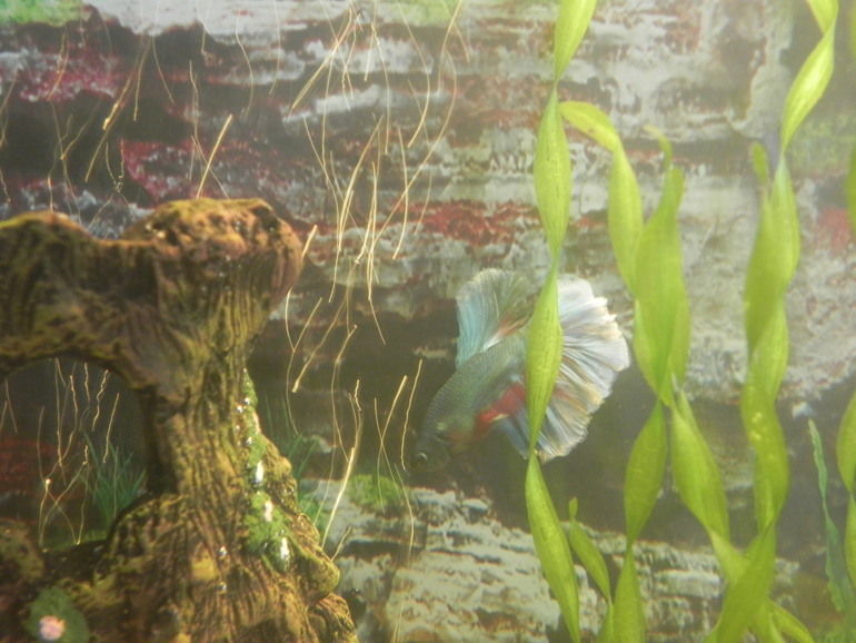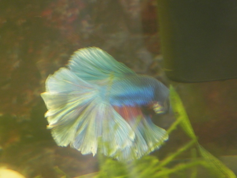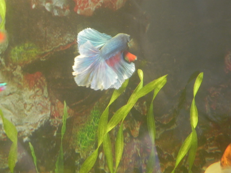 не получается сфотографировать нашего Петеньку лучше - не тянет аппарат. В жизни раз в 100 ярче. Младший называет его Попугайчиком. Активный мальчик. Я влюблена до глубины души. Красив нереально. Ехали за красно-синим, а взяли бирюзового с окрасом бабочки. Те у него 3 цвета, бирюзовый, синий и красный. А бирюзовый переливается на хвосте до белого. А хвост - это нечто. Такая вуаль шикарная.