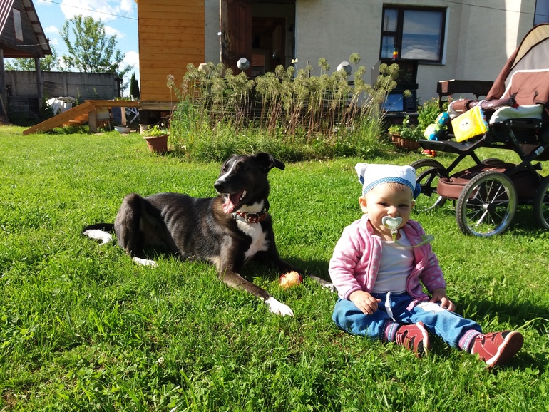 Деверь подобрал на улице еще щенком, и отдал нам. Собака очень умная, команд знает десятки, учится на раз-два. При этом безумная трусиха.