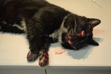 у было кота раздроблено небо, вытек один глаз полностью, второй тоже выпал наполовину, многочисленные переломы, разрывы внутренних органов.