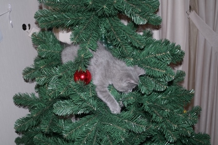 Иногда на неё просто находит дикое желание что-нибудь эдакое выбросить, и она начинает искать потенциальные источники веселья. Как минимум будет поскидано все с детского стеллажа - просто летящие вниз коробки, приземляющиеся с грохотом на пол, доставляют ей массу удовольствия. Постоянно скидывает мой телефон с тумбочек! А видели бы вы нашу елку новогоднюю... Я в первый совместный с кошкой Новый год чуть ли не рыдала - заходишь утром в комнату, ёлка голая, все лары примяты в произвольном порядке (ёлка искусственная), верхушка погнутая!, звезда валяется на полу, а игрушки равномерно рассредоточены по всем углам... Приведёшь в порядок, получишь то же самое ровно через полчаса. В этот Новый год я уже словила дзен и забила на елку, привела в порядок только 31 декабря и то только из-за фото😂