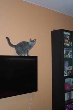 И да, она падала 2 раза в унитаз, 1 раз в ванну с водой и 1 раз в аквариум, потому что интерес к воде превыше всего, а осторожность иногда подводит)) Она не убегает от пылесоса и фена - просто забирается повыше и наблюдает! Она умудрилась упасть! с подоконника на фитбол и проткнуть его когтями. А из последних развлечений ее больше всего привлекает люк в туалете - следит, когда его вдруг оставят открытым в связи с необходимостью, запрыгивает, спускается вниз к трубам и обратно лезет вверх по трубам! К люку ее больше не подпускаем...