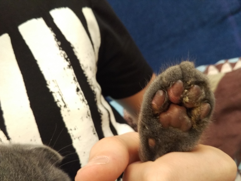 Кошки. Болезни, прививки, советы по уходуДорогие ББшки, помогите советом, чем помазать подушечку на лапке котенка, уже несколько дней заметила что моя Лавуся (Лаванда) как-то приподнимает лапку, как будто она у ее болит, но она бегает, прыгает, это у нее происходит периодически. Потом обратила внимание на то что на одной лапке подушечки как будто припухшие и между подушечек шерсти меньше на одной лапке, чем на другой. Помазала левомеколем, также попшыкала кортавансом, чем можно еще помочь ей? фото лапки под катом