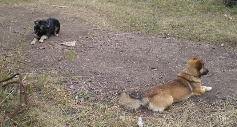 29 сентября уговорила мужа оставить нам Рыжика. Сын зовет Опёнок. Я вечером зову Рыжий Опёнок, бежит, несется, как будто вот только что спрятался за углом и ждал, когда позовут. Взрослый, но молодой как будто. Наверно год ему. Сжимается, когда слышит крики, удары (строители в 15-20 метрах доски кидали). Муж говорит, на лбу под шерстью шрамы. Привыкший к ошейнику и цепи. Зову, цепляю - ни намека на недовольство. Покорный. Когда подхожу, сразу бросается под ноги и не шевелится, ждет, чтоб погладили. Черный наоборот прыгает, пытается лапами обнять, морду подмышку. Между собой практически не общаются, Черный лежит, голову поворачивает, когда Рыжий бегает по периметру, Обнюхивают иногда друг друга. Но во время кормежки рычат, лают. Рыжего пока цепляем на завтрак - ужин. Т.к. Черному не дает нормально поесть.