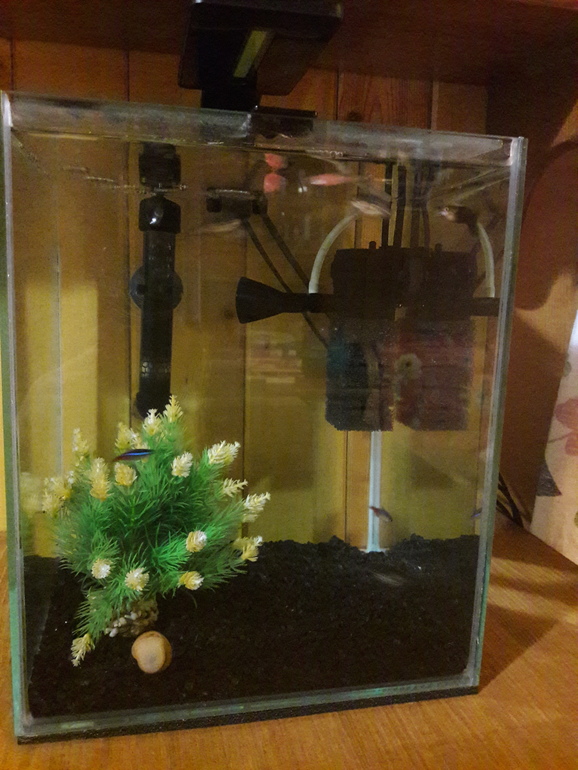 Новости сообществаАквариум появился в нашем доме стихийно. 20л, есть свет, фильтр, аэрация. Грунт, кладофора, декор. Рыбки: 3 гуппи( одна погибла), 5 неонов( осталось 2), розовые и полосатые стайка( всего 5) не знаю как зовуться, сом, улитка. Запускали с применерием средств Тетра, воду на 30 проц. Раз в нед. Меняю . Кормлю 1 р/д, один разгрузочный день в неделю. Рыбки погибли( частично, думаю что из-за плохой воды. Вопрос как чистить грунт от какашек, их немало накапливается? Можно ли на ночь кислород выключать?