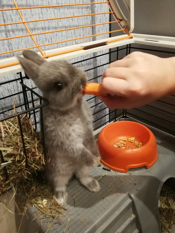 Ухода большего не требует. Кушает хорошо, никого не кусает. Был один раз, прихватил мне руку, но это произошло случайно, когда насыпала корм. Единственное не любит, когда берут на руки,может боится и начинает вырываться и может оцарапать, у них очень сильные лапы и сами кролики очень юркие и шустрые. Поэтому гладим его, когда подходит или просто сажаю к себе на колени потому что не по обнимать и не потискать такой пушистый комочек ну просто невозможно)).