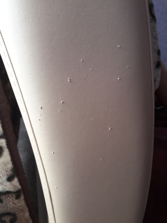 Лохмотья вокруг дырочек вправляете вовнутрь толстой иголочкой или спицей. Берёте жидкую кожу под цвет и кусочек кожи ( кожзама) под структуру обивки. Мажете каждую дырочку аккуратно и придавливаете кусочком кожи. Если цвет совпадёт, увидите только эти места под лупой, если нет - без лупы, но всё равно будет посимпатичней, чем сейчас. У меня тоже такая проблема была, пока я не избавилась от всей кожи( кожзама).