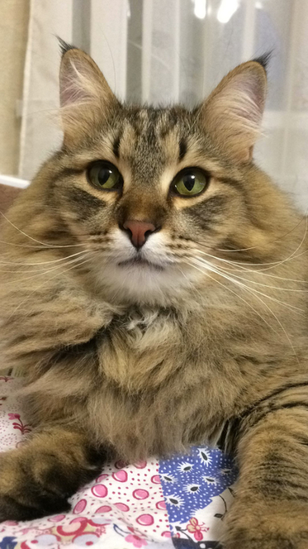 . Ушки с кисточкой, хвост любая белка отдыхает - да и вобщем то он полностью волосатый донельзя)). Ни один вет не может точно сказать с какой породой помесь - все отшучиваются, что помесь всех пушистых . Ему 1,5 года