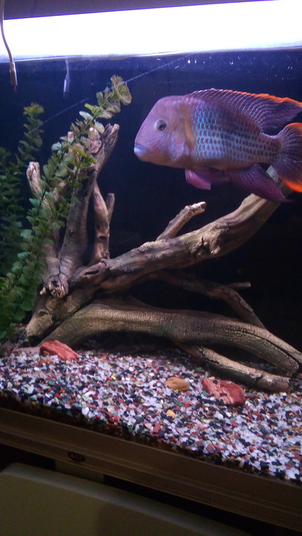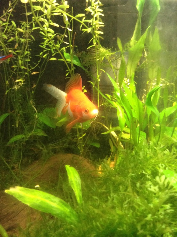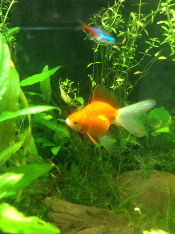 Но я не ожидала, что это такая красота, от аквариума трудно оторвать взгляд), он очень интересно смотрится с неонами (хотя конечно это не очень сочетаемая рыба), в общем я всерьез задумалась, а не обзавестись ли мне баночкой литров на 180 и посадить туда 3 золотых риукинов и одного черного телескопа?))))