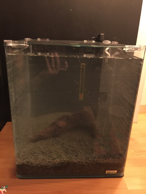 Сначала банка стояла с водой пустая. Потом добавила туда грунт и декор. И фильтр. И термометр, но ему не повезло и я его сломала ещё до того, как налила туда воды. Так что термометра пока нет, но скоро будет. Подогреватель при стабильных 24 градусах дома решила не ставить, так что в термометре пока сильно не нуждаюсь.