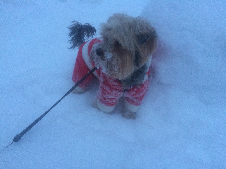 Наши любимцы!Арчи в шоке, От такого количества снега выпавшего сегодня, утопал в сугробах